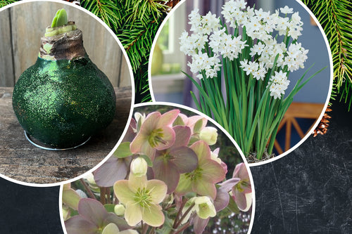Dazzling wax amaryllis, elegant hellebores, and fragrant paperwhites.