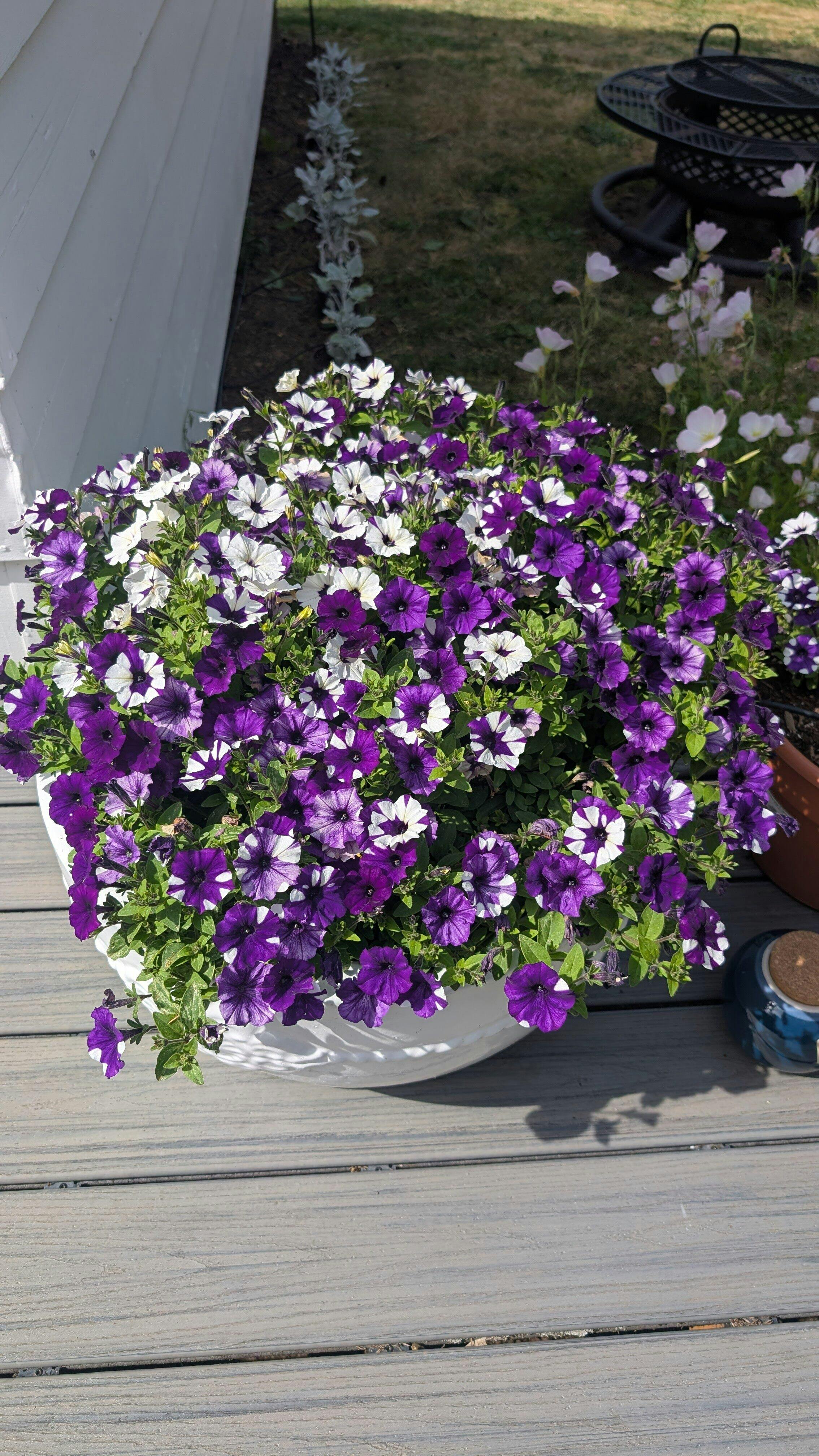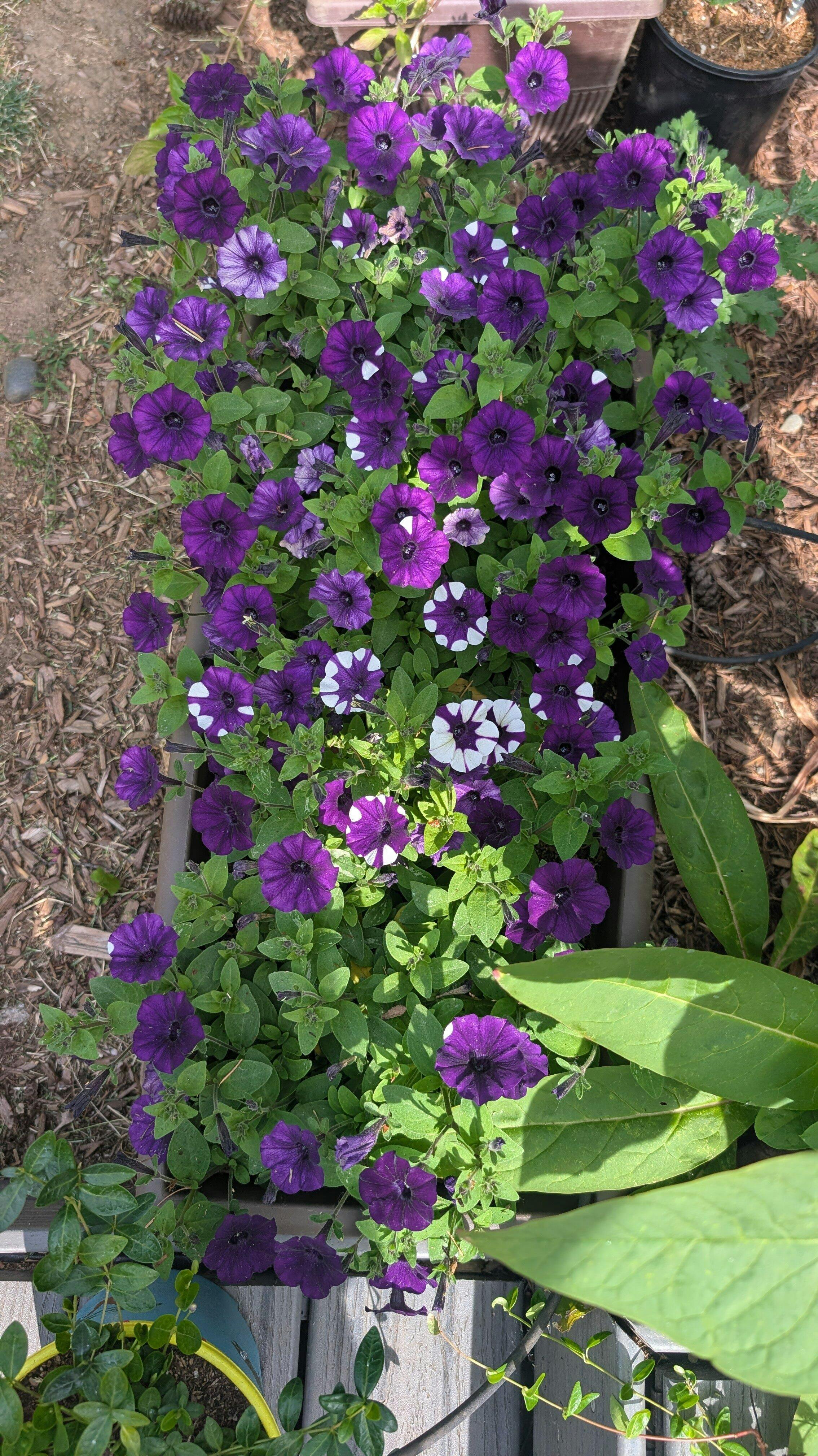 Petunia hybrida The most dynamic petunia on the market, this newest member of the Wave® family is sending ripples of delight through the bedding annual world. Mounding plants grow 7-10 inches tall and spill 20-30 inches wide, showered with smaller blooms that really pack a punch! Each flower has its own individual personality with a combination of bright white and deep purple in exciting patterns. These petite blooms are resilient to weather and keep the color in hanging baskets, mixed planters or the landscape all summer long. Germination code: (1) and (6)